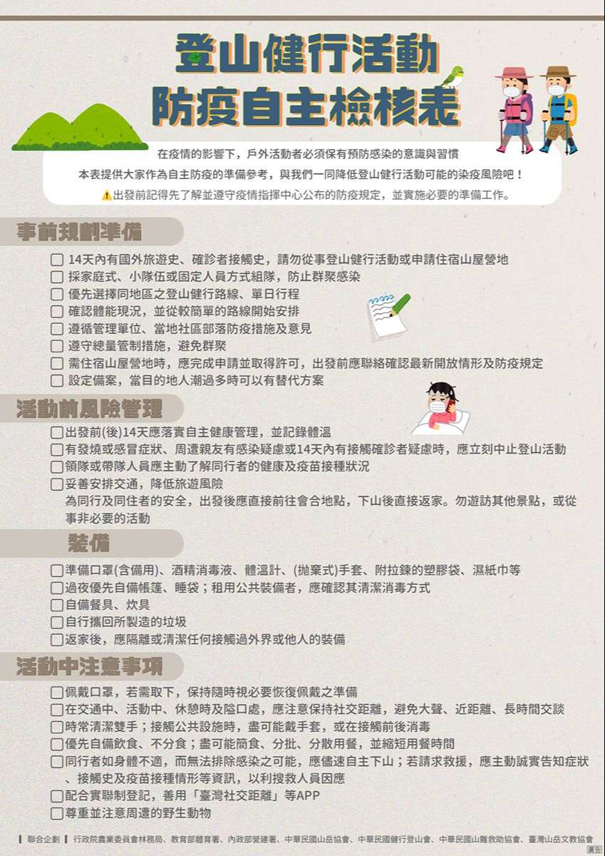 | 二、 | 有鑑於近日嚴重特殊傳染性肺炎疫情趨緩,國內登山、健行等戶外活動重新熱絡,請各單位協助配合旨揭宣導事項,如於疫情期間有從事登山、健行活動務必配合防疫政策,落實防疫自主管理事項。 |