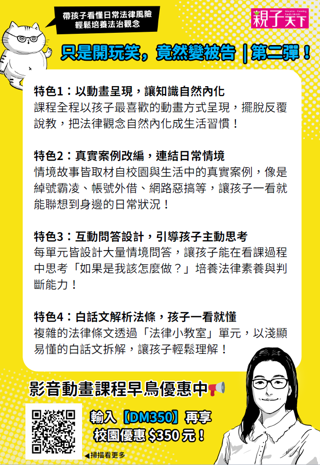 親子天下全新推出之法治教育線上課程《只是開玩笑,竟然變被告?2》校園專屬優惠資訊
