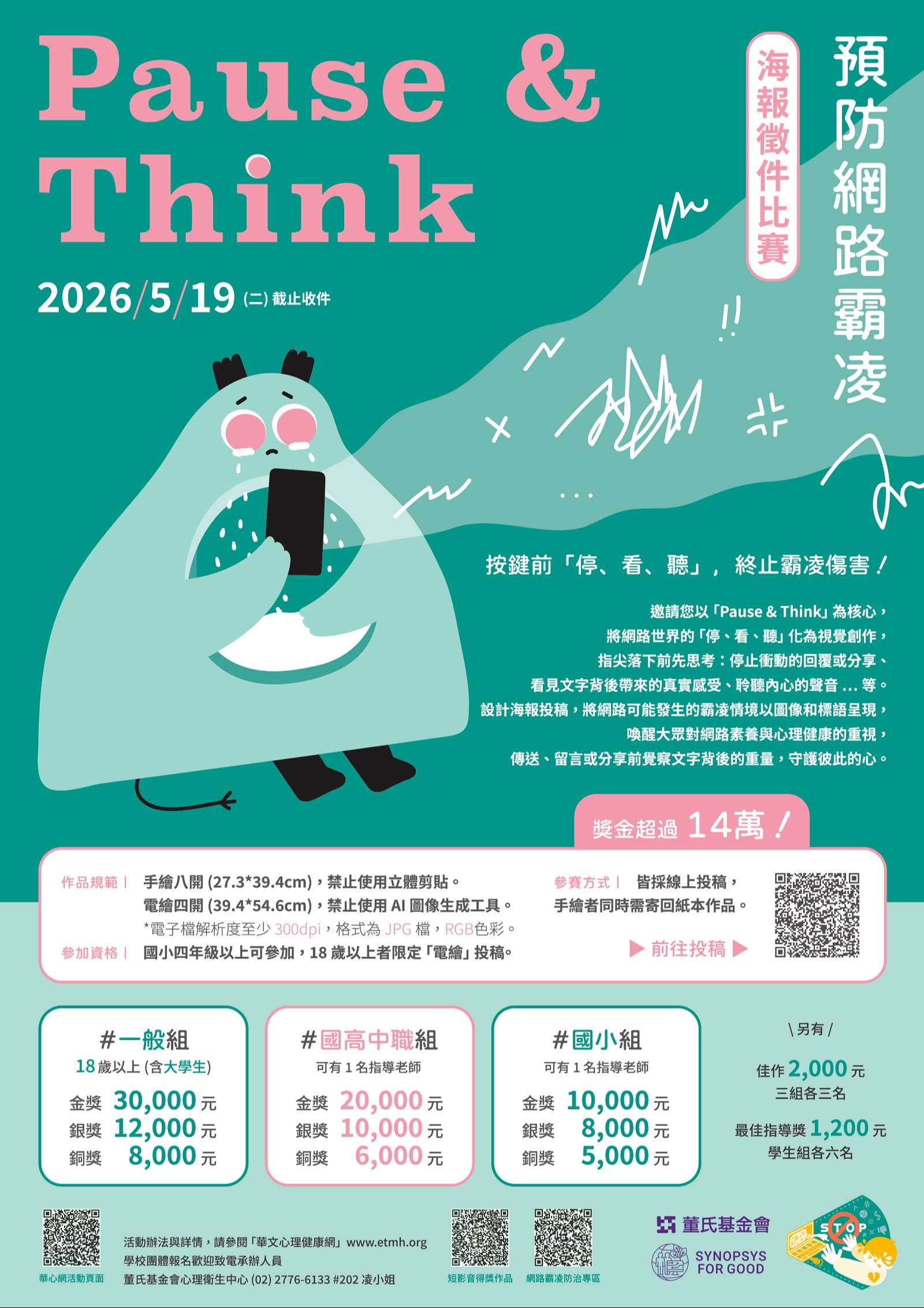 轉知財團法人董氏基金會辦理「Pause & Think」停止網路霸凌海報徵件比賽活動資訊。